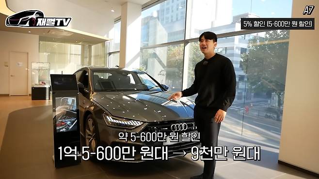 우리 구독자분들이 사랑하는 A7도 있는데요. 쿠페형 세단을 그렇게들 사랑하더라고요. 독3사, 가성비 다 따져봐도 이 A7만큼은 디자인으로 깔 수가 없거든요. 이건 워낙 또 인기 차량이기도 하고... 이 차가 원래 9,000만 원대거든요. 근데 23년식은 가격이 올라서 1억 한 500~600만 원대에 시작한다고 해요. 이제 1억이 넘는다고 하는데, 워낙 인기가 많은 차라 강력한 할인까지는 어렵고 5% 할인 들어간다고 하네요.