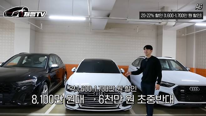 다음으로 A6는 여러분이 가장 많이 아는 차일 거예요. G80에도 이제 막 비비는 수준까지는 왔고, E클래스랑 5시리즈가 너무 강력하게 나오다 보니까 비교적 좀 살짝 아쉽기는 한데... 이 차는 한 20~22% 정도 할인이 들어간다고 하고요. 이 차 시작 가격이 8,100만 원 대거든요. 그럼 이 차를 6,000만 원 초중반에 살 수 있는 거네요. 그럼 지금 가격대에선 좀 경쟁력이 있네요. 중간 등급은 한 600만 원 더 떨어진다고 해요.