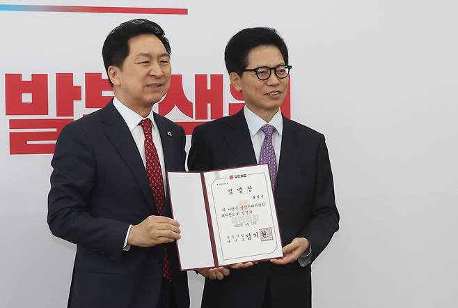 | ▲ 김기현 국민의힘 대표가 17일 오전 서울 여의도 국회에서 열린 주요당직자 임명장 수여식에서 황정근 중앙윤리위원회 위원장에게 임명장을 수여하고 있다. |