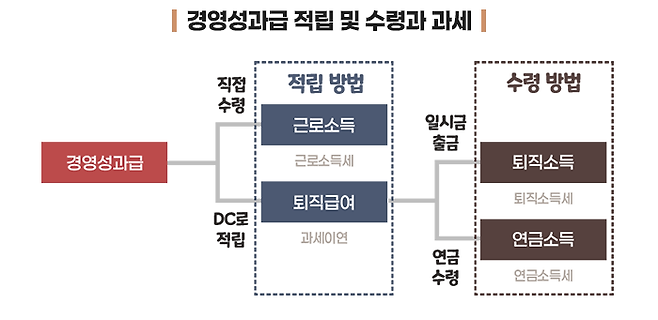 아래 그림은 경영성과급을 적립하는 방법과 수령 방법 및 부담하는 세금의 종류를 정리한 것입니다. 참고하셔서 잘 활용하시기 바랍니다.