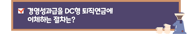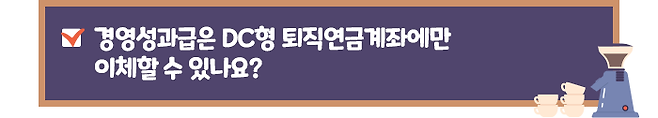 즉, 매년 발생하는 퇴직급여를 DB형과 DC형에 나눠서 적립하는 것이죠. 경영성과급은 DC형 퇴직연금계좌에만 적립할 수 있으니, 혼합형 퇴직연금제도를 설정하면 됩니다.