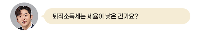 네. 상대적으로 낮은 편입니다. 퇴직소득은 근로소득과 다르게 다른 소득과 합산해 종합과세가 되지 않고 따로 떼어 분류과세 됩니다. 그리고 세금을 산출할 때 연분연승 방법을 적용하며, 각종 공제 혜택이 많기 때문입니다.