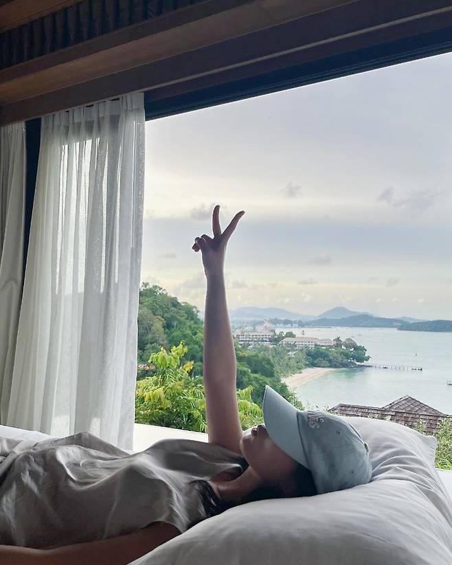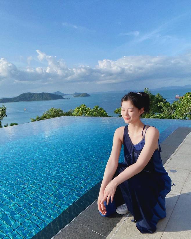 김유정의 휴양지 셀카는 마치 그림처럼 평화로워요.