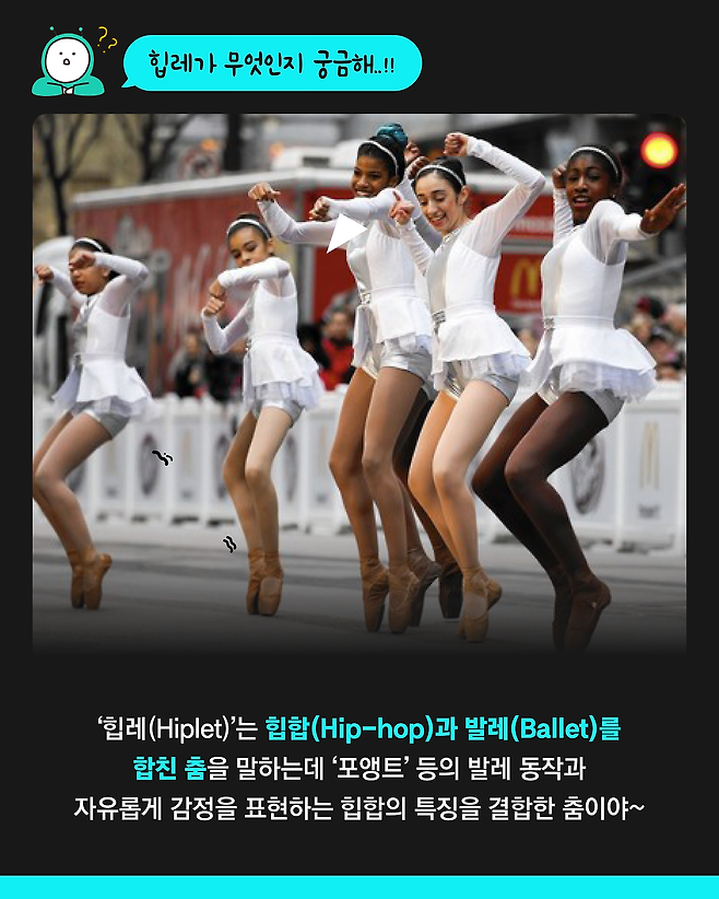 힙합과 발레를 합쳐 ‘힙레’라고 불리는 이 춤은 ‘포앵트’ 등의 움직임을 통해 발레와 자유롭게 감정을 표현하는 힙합의 특징을 결합한 춤입니다.