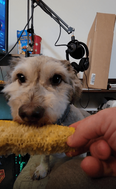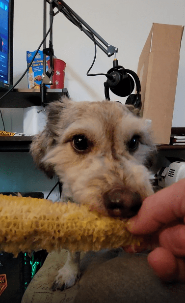 주인이 건네자마자, 강아지는 지체 없이 입을 옥수수에 바짝 대고 알갱이를 능숙하게 뜯어먹기 시작합니다. 앞니로 콕콕 눌러 떼어내고, 고개를 살짝씩 기울이며 좌우로 리듬을 타는 모습엔 경험자의 여유가 묻어납니다. 중간중간 꼬리를 살랑이며 "맞아, 이 맛이야!"라고 외치는 듯한 반응까지. 이미 수차례 먹어본 간식임이 분명하지만, 그 맛을 대하는 마음은 여전히 설렘 그 자체입니다.