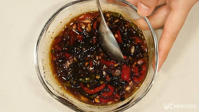소스는 설탕 1큰술, 양조간장 2큰술, 맛술 1.5큰술, 물 2큰술, 후추를 약간 섞어 만든다. 팬에 소스를 붓고 설탕이 완전히 녹을 때까지 저어준다. 여기에 준비해 둔 홍고추와 청양고추를 넣어 매콤한 향을 더한다.