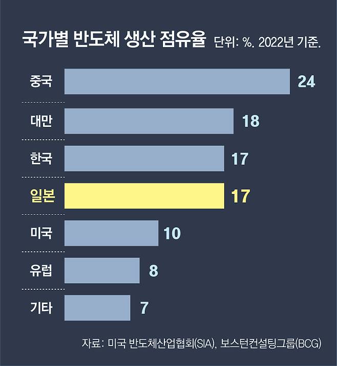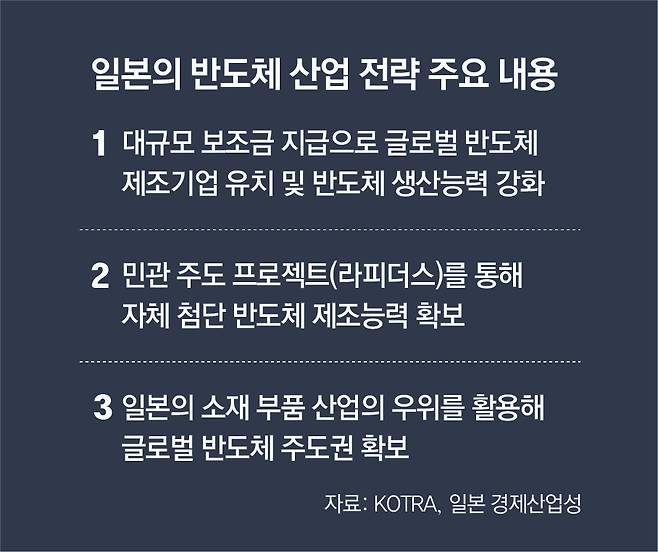 그렇게 일본 반도체가 무너졌다. 2012년 NEC와 히타치의 반도체 사업 부문이 통합해 설립된 ‘엘피다’ 파산, 2017년 도시바 반도체 부문 매각, 2019년 파나소닉 반도체 공장 매각 등으로 글로벌 시장에서 일본 반도체 기업의 존재감은 점차 옅어졌다. 시장조사기관 가트너에 따르면 지난해 기준 일본 반도체 기업은 반도체 제조사 매출 상위 10개사 가운데 한 곳도 이름을 올리지 못했다. 반면 한국의 삼성전자와 SK하이닉스는 각각 2, 3위에 올랐다.