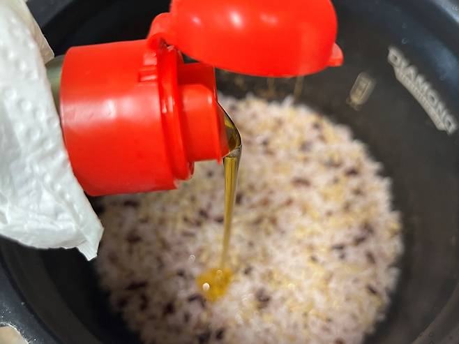 밥에 맛소금과 참기름, 통깨를 넣어서 밑간을 해주세요. 김밥에서 밥은 별로 중요하지 않아 보일 수 있지만, 사실 전체 맛을 좌우하는 가장 중요한 기본입니다.