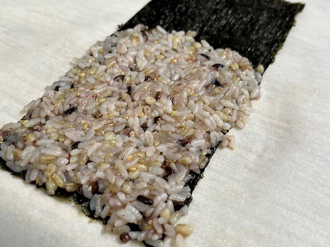 저는 요즘 김밥 만들 때 김을 1/2로 잘라서 말고 있습니다. 이렇게 하면 김밥 크기가 작아져 김밥을 말기가 훨씬 쉽고 모양도 예쁘게 나옵니다. 김의 약 2/3 면적에 밥을 얇게 깔아줍니다.