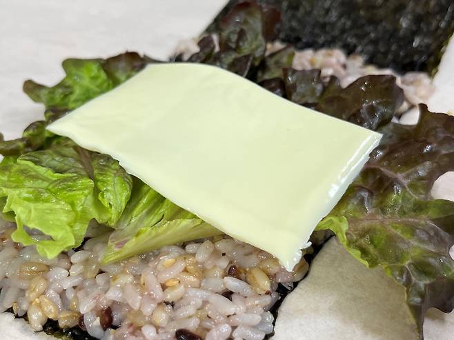 상추와 슬라이스 치즈 1/2 등분을 하여 올려 주세요. 상추는 크기가 너무 크다면 반을 잘라서 올리세요. 상추를 넣으니 식감과 신선한 맛이 살아나서 좋았습니다.