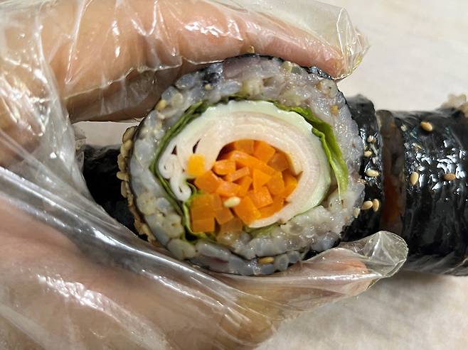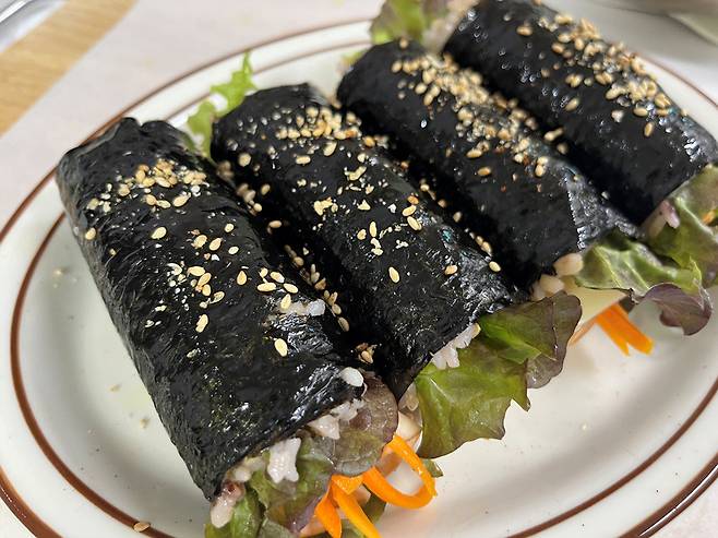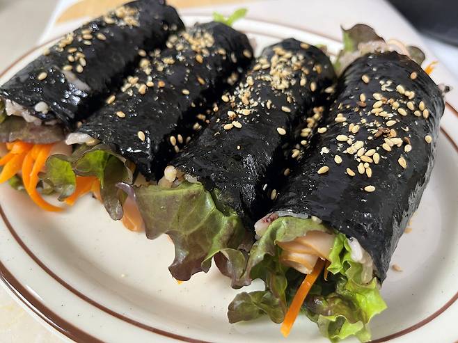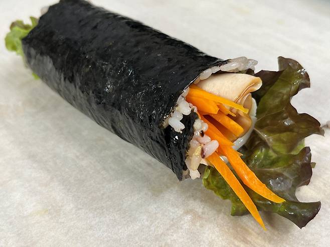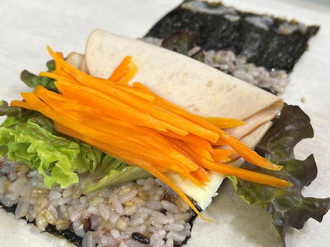 단무지나 햄 등이 들어가지 않아 맛이 전혀 자극적이지 않고 담백해요. 거기에 치즈, 당근의 감칠맛이 어우러져 담백하면서도 정말 맛있는 김밥이 되었습니다.