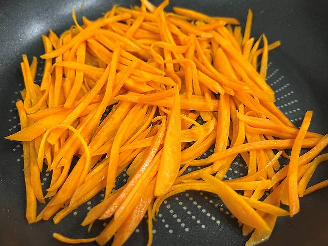 당근 1개는 채 썰어서 볶아서 준비합니다. 김밥 만들 때마다 저는 당근을 꼭 넣고 있는데요. 당근만큼 감칠맛과 색감을 동시에 살려주는 재료도 드뭅니다.