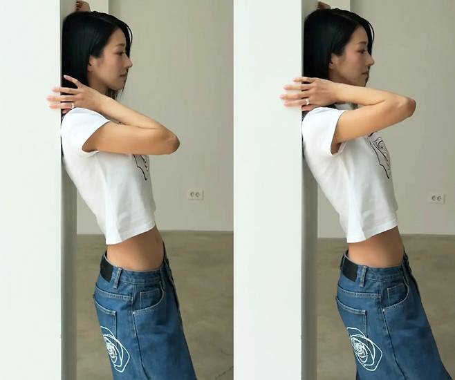 서예지는 흰색 크롭티에 장미 프린팅이 더해진 진청 데님을 매치해 무심한 듯 시크한 데일리룩을 연출했습니다.