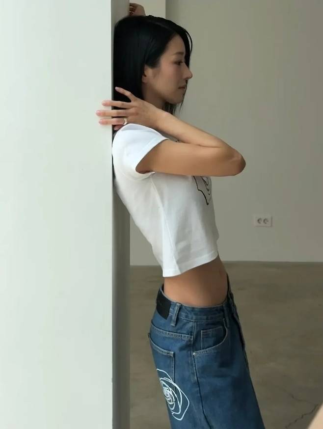 서예지는 흰색 크롭티에 장미 프린팅이 더해진 진청 데님을 매치해 무심한 듯 시크한 데일리룩을 연출했습니다.