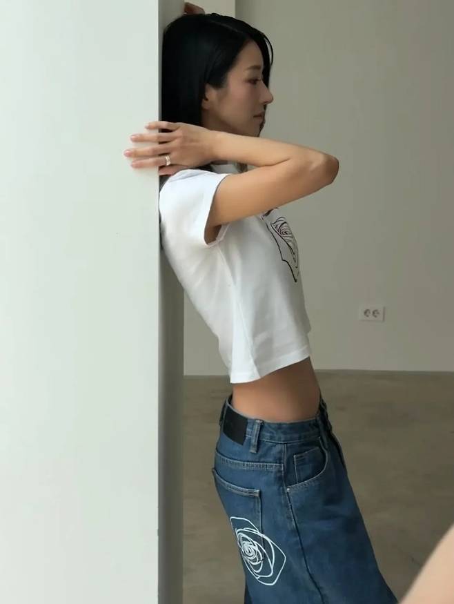 서예지는 흰색 크롭티에 장미 프린팅이 더해진 진청 데님을 매치해 무심한 듯 시크한 데일리룩을 연출했습니다.