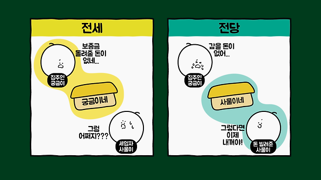 전당의 목적은 대출인 거래입니다. 따라서 채무를 상환하지 못하면 부동산이나 물건 소유권 등이 돈을 빌려준 사람에게 온전히 넘어가는데, 전세는 집 사용이 목적인 거래이므로 집주인이 보증금을 돌려주지 못해도 세입자는 집 소유권을 완전히 받지 못하기에 성격이 다릅니다.