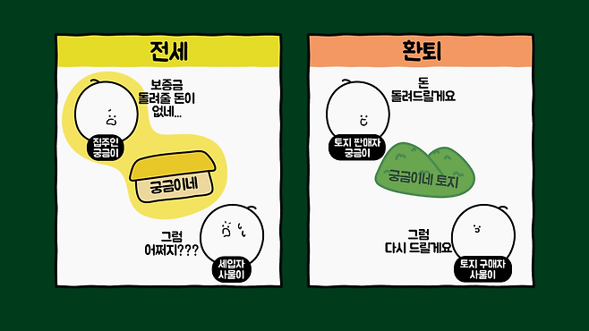 또 환퇴는 판매액을 환불받는 조건으로 다시 토지를 원주인에게 돌려준다는 부분에서 전세와 얼핏 비슷하나 가옥이 아니라 주로 토지 매매시에 이루어지는 계약이라서 성격이 다릅니다.