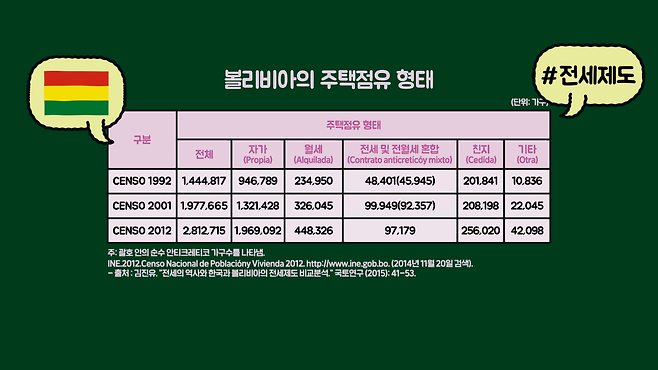 전세는 일반적으로 무언가를 빌려준 뒤 이익을 취하는 월세나 자동차 렌트, 은행 대출 등과는 대단히 다른 방식입니다. 그래서인지 한국의 전세 제도처럼 운용되는 나라는 대단히 찾기 어려운데, 그나마 볼리비아의 안티크레티코(Anticretico) 제도와 같은 사례 정도가 있긴 합니다.