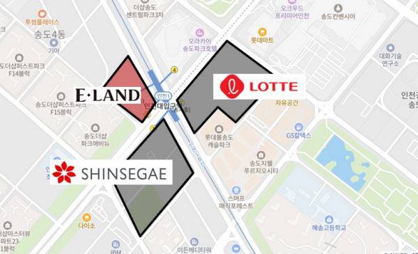 타임빌라스 송도점이 있는 인천 지하철 1호선 인천대입구역 사거리는 복합 쇼핑몰 집결지가 될 전망이다. 5번 출구에는 롯데가, 3번 출구와 1번 출구에는 이랜드리테일과 신세계가 각각 쇼핑몰을 짓기로 했다.