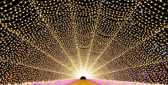 수만 개의 전구가 촘촘하게 박혀 있어 터널 안을 걷는 내내 얼굴을 화사하게 밝혀주는 반사판 효과를 톡톡히 볼 수 있습니다.