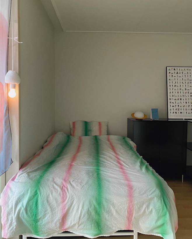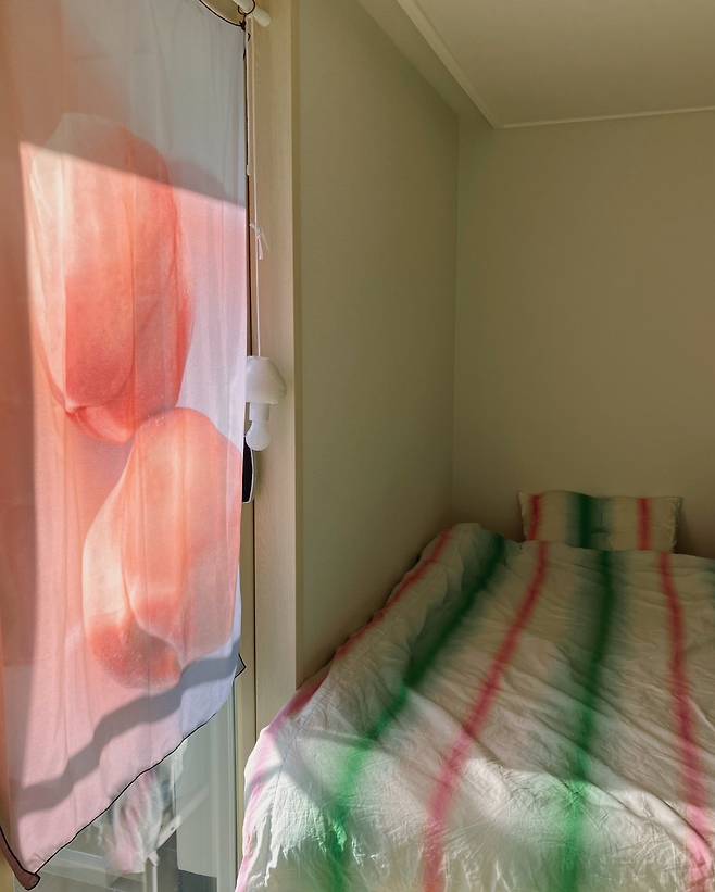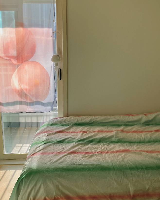 원래는 그린 단색 이불을 사용했어요. 하지만 단색이라 그런지 쉽게 질리더라고요. 그렇다고 화려한 패턴을 쓰자니 집에서 어지럽게 느껴질 것 같아, 이번엔 최대한 깔끔하면서 포인트를 줄 수 있는 제품으로 선택했어요. 초록과 분홍이 옅게 들어간 제품인데, 여기에 복숭아가 그려진 커튼까지 더하니 여름 분위기가 나서 좋아요.
