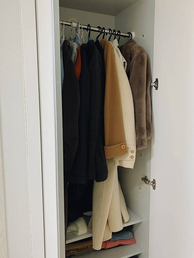 그렇게 옷장으로 바꾸어버린 신발장의 모습이에요. 선반을 제거하고 무타공 압축봉을 설치했는데, 생각보다 튼튼해서 겨울 아우터 4~5개를 걸어두어도 끄떡없습니다. 아래쪽에는 선반을 빼지 않고 바지, 가방, 모자를 수납해두었어요. 신발장 자리에 옷장이 있으니 외출하고 다녀와서 바로 옷을 걸어둘 수 있어서 너무 편리합니다. 이처럼 기본 옵션으로 있는 가구의 새로운 쓸모를 찾는 것도 인테리어의 한 방법인 것 같아요.
