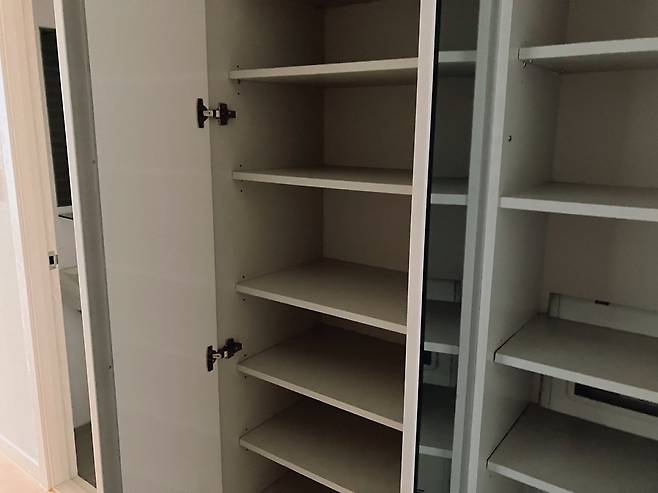 저희 집에 있는 신발장은 가로로 3칸이고 꽤 넓어서 공간 차지가 컸어요. 그래서 용도를 바꾸어 1칸은 옷장, 1칸은 신발장, 1칸은 다용도 보관함으로 나누어 사용하기로 했습니다.
