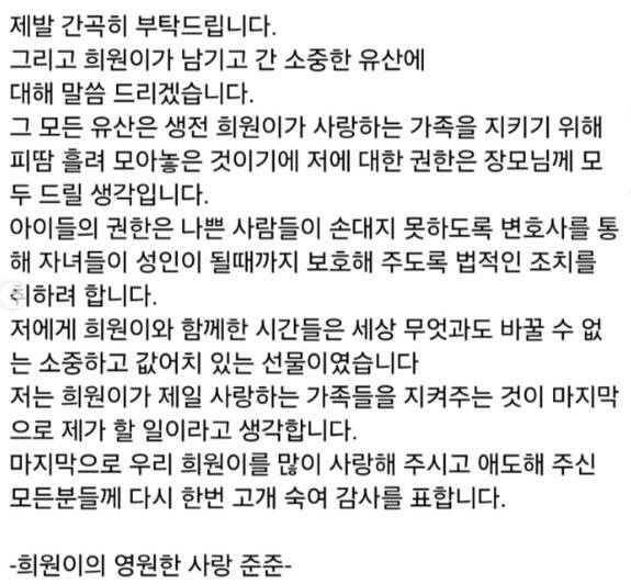 구준엽 씨는 “크나큰 상실의 아픔과 애도가 지나가기도 전에 악마 같은 사람들이 우리 가족들과 저의 사랑을 매도하기 시작했다. 우리 가족에게 흠집을 내려고 보험과 비용에 대한 가짜 뉴스를 만들어 상처를 주고 있다”라며 안타까운 마음을 전했습니다. 그는 유산에 대해 “제 권한은 모두 장모님께 드릴 생각”이라며 “아이들의 권한은 나쁜 사람들이 손대지 못하도록 변호사를 통해 자녀들이 성인이 될 때까지 보호하도록 법적 조처를 하려고 한다”라고 밝혔습니다. 그의 이러한 결정은 슬픔 속에서도 가족을 지키고자 하는 헌신적인 마음을 보여주는 대목입니다.