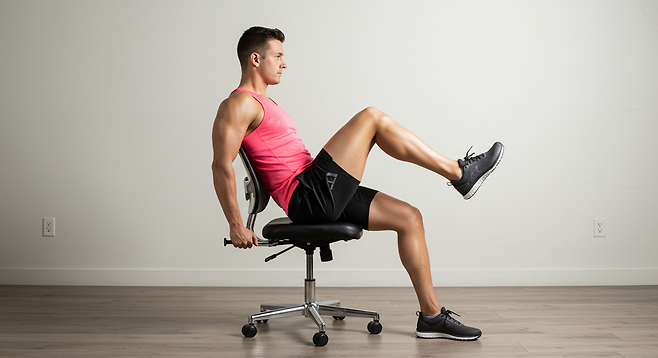 등을 곧게 세우고 양손으로 의자 옆을 잡습니다. 다리를 곧게 펴고 바닥과 평행이 되도록 들어 올린 뒤, 천천히 내립니다.