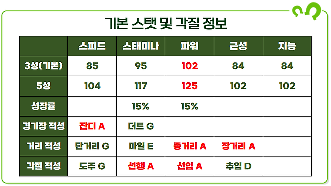 ■ 스탯 성장치 : 나쁨 URA나 아오하루, 클라이맥스 시절만 해도 스태미나 및 파워에 성장치가 있는 일명 고루시식 성장치가 나쁜 것이 아니었지만, 시대가 바뀌었습니다. 스피드 스탯이 1700을 기본 베이스로 깔고 가는 시대에 스피드 성장치가 없고, 스태미나 서포트는 많이 써봐야 한 장, 파워 서포트는 아예 쓰이지 않는 시대이기 때문에 사실상 성장치 이득을 거의 받지 못하는 케이스입니다.