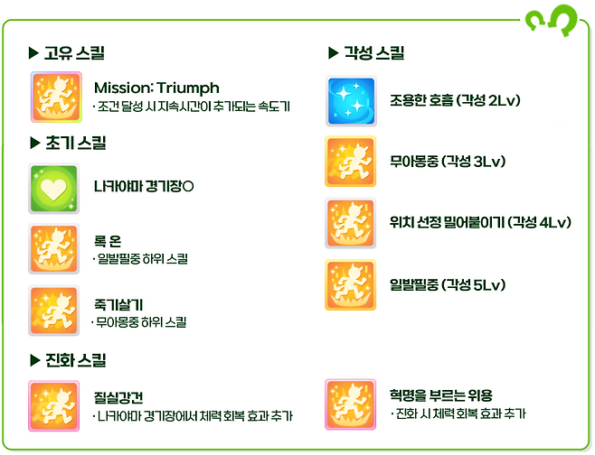 ■ 추천 각질 : 선입 각질 자체는 선행도 A고, 추입도 D로 충분히 개조가 가능하지만, 무아몽중 스킬이 선입 고정이기 때문에 선입으로만 쓰입니다.