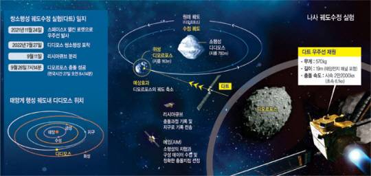 DART 우주선은 무게가 570㎏, 디모르포스는 50억㎏에 달한다. 나사는 충돌 시 발생하는 운동에너지로 소행성 궤도를 1% 정도 변화시킬 것을 기대했다. DART 우주선은 충돌 4시간 전 약 9만㎞ 밖에서 마지막 경로 조정을 하며 ‘스마트(SMART) 항법’ 비행체제로 완전히 전환해 관제팀 지시 없이 카메라에만 의존해 스스로 목표물을 찾아갔다.