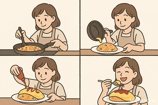 집에서 손쉽게 만들 수 있는 볶음밥 오므라이스는 먹을 때마다 어린 시절의 추억을 떠올리게 한다.