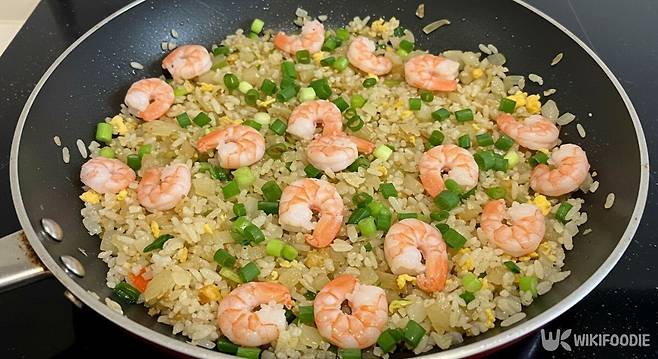 파가 숨을 죽이면 양파와 새우를 넣고, 분홍색이 돌 때까지 익힌다. 즉석밥 2개는 차가운 상태에서 넣는 것이 좋다. 그래야 밥이 알알이 퍼지며 재료와 잘 섞인다. 이제 소금으로 간을 맞추고 볶은 뒤, 참기름 1스푼을 넣어 마무리한다.