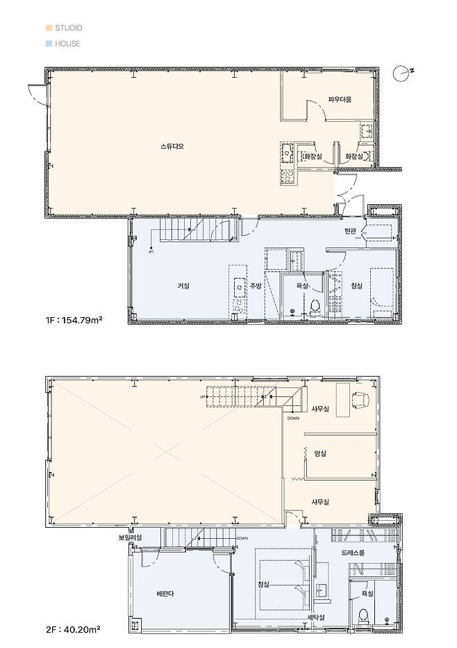 보통의 상가주택이 층별로 공간을 구분 짓는 것과 달리 더스튜디오는 두 공간이 옆으로 붙어 있는 특별한 구조다. 집과 스튜디오는 1층과 2층에서 각각 연결되어 있어 공간으로의 이동이 편리하도록 구성했다. 미니멀하고 깨끗한 톤앤매너를 의도했던 건축주는 화이트 톤으로 전체 공간의 배경을 깔고 그 위에 연한 그레이, 콘크리트, 자작 합판 등 옅은 컬러들을 레이어드했다.