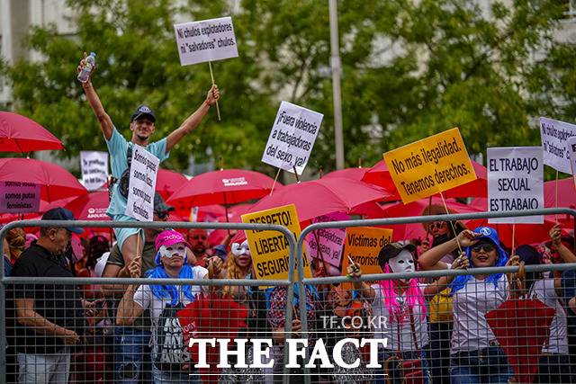 [더팩트|이선화 기자] 12일(현지시간) 스페인 마드리드의 의회 앞에서 열린 성매매 알선 포주에 대한 처벌을 강화하는 등의 내용이 담긴 성매매 근절법 반대 시위가 열린 가운데 시위 참가자들이 피켓을 들고 처벌 반대를 요구하고 있다.