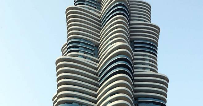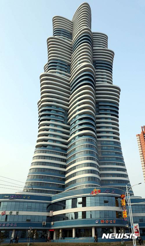[서울=뉴시스] 김종민 기자 = 김정은 주도로 평양 한복판에 세워진 53층 고층 아파트가 심각한 균열과 부식으로 붕괴 우려를 낳고 있다. 해당 초고층 주상복합아파트 '은하'는 핵·미사일 과학자