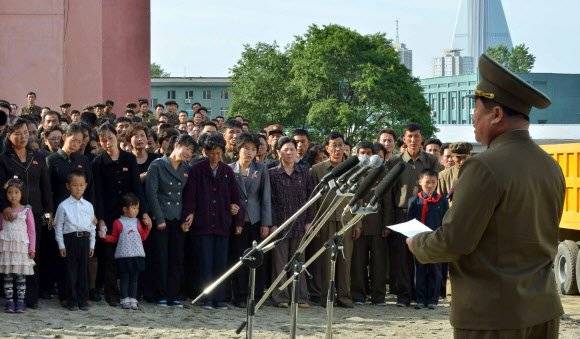▲ 북한 평양시 평천구역의 23층 아파트 붕괴사고와 관련해 17일(현지시간) 북한 관리들이 사고 현장을 방문, 유가족과 주민들에게 사과하고 있다. 지난 13일 붕괴된 이 아파트는 정식으로 완공되지 않았으나 92가구가 미리 입주해 살고 있었던 것으로 알려져 상당한 인원이 사망했을 것으로 추정된다.