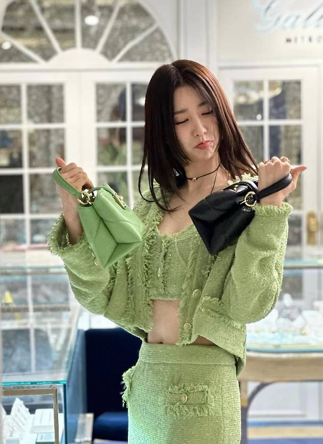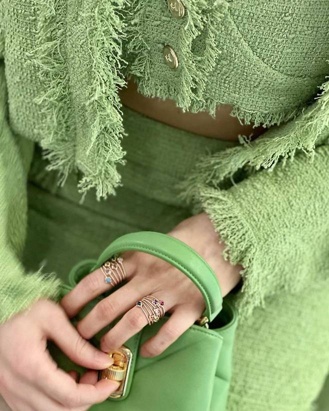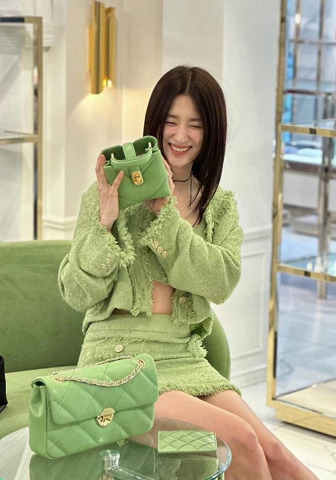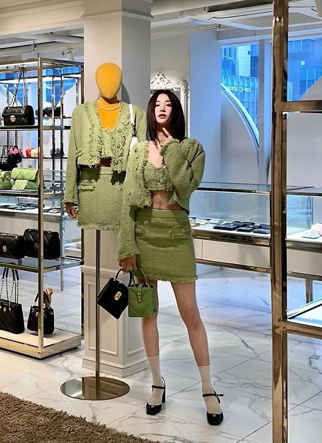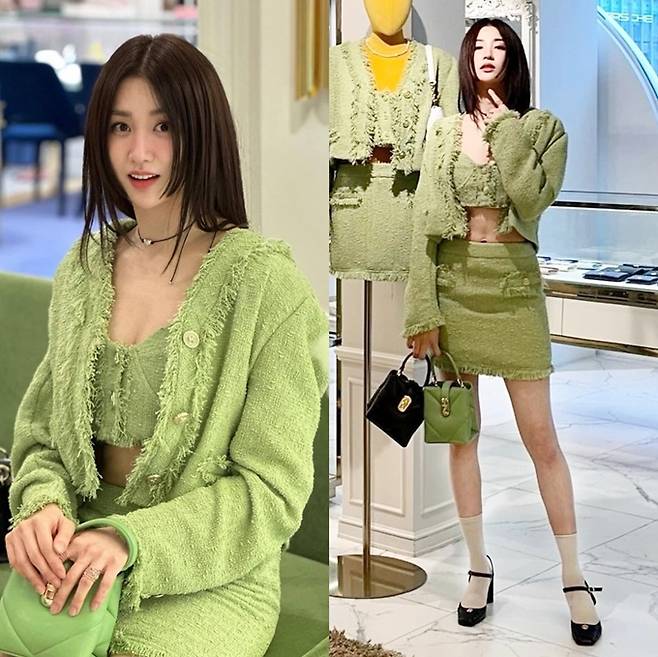 공개한 사진에서 박하선은 트위드 그린 브라톱과 재킷, 트위드 미니 스커트의 올 그린 셋업 트위드룩으로 37세 나이를 잊은 요정미를 드러냈다.