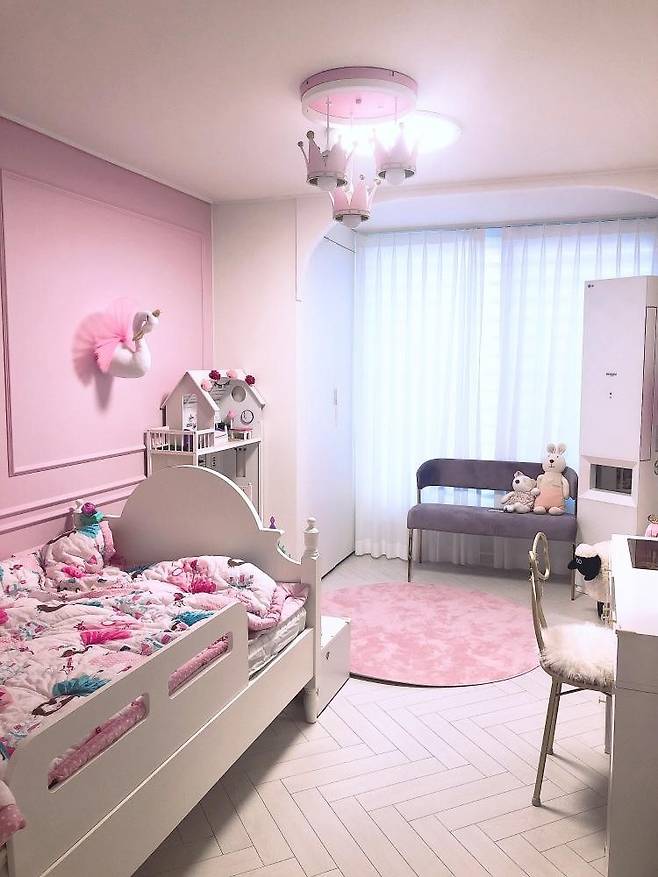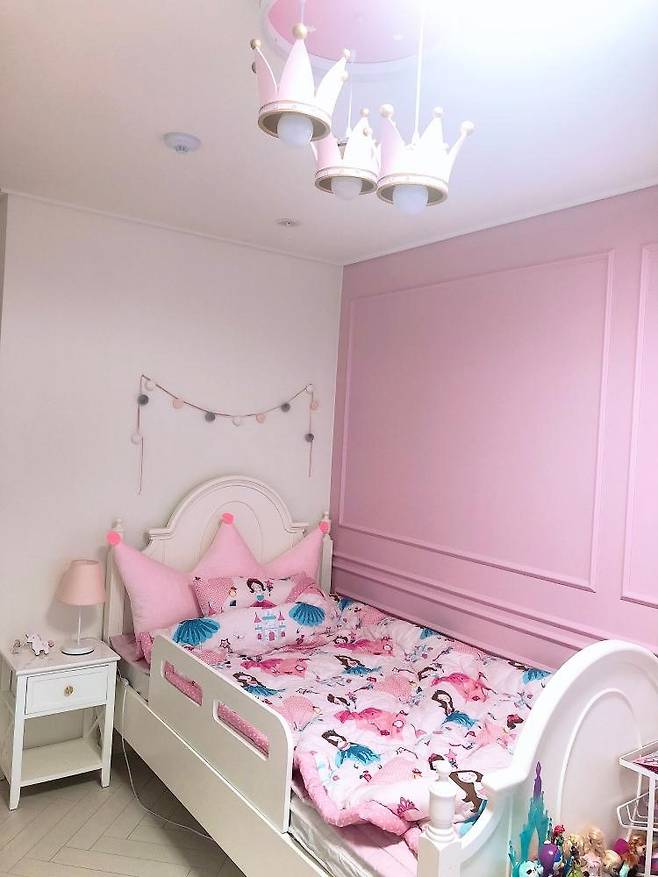 툭 튀어나온 기둥을 역시나 아치로 만들어 주고 핑크 좋아하는 공주 딸의 취향에 맞게 핑크핑크 러블리방을 만들어주었어요.