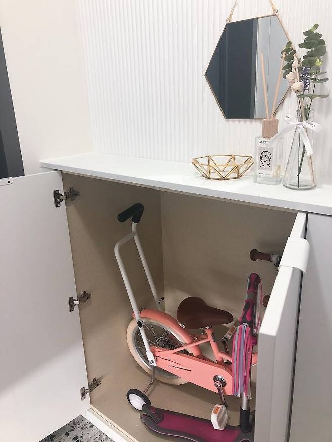 바로 자전거 공간입니다. 복도에 둘 공간이 없어서 야외에 두어야 하는데 그게 싫어서 하부장을 좀 더 크게 제작했습니다.