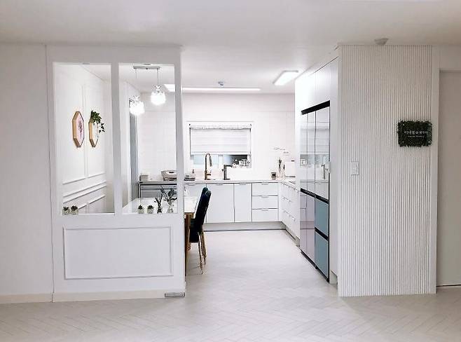 부엌과 거실이 오픈된 걸 좋아하시는 분도 많으신데 저는 분리가 되어 다이닝룸 같은 느낌이 나는 게 좋아 답답하지 않은 파티션으로 구분을 해보았습니다.