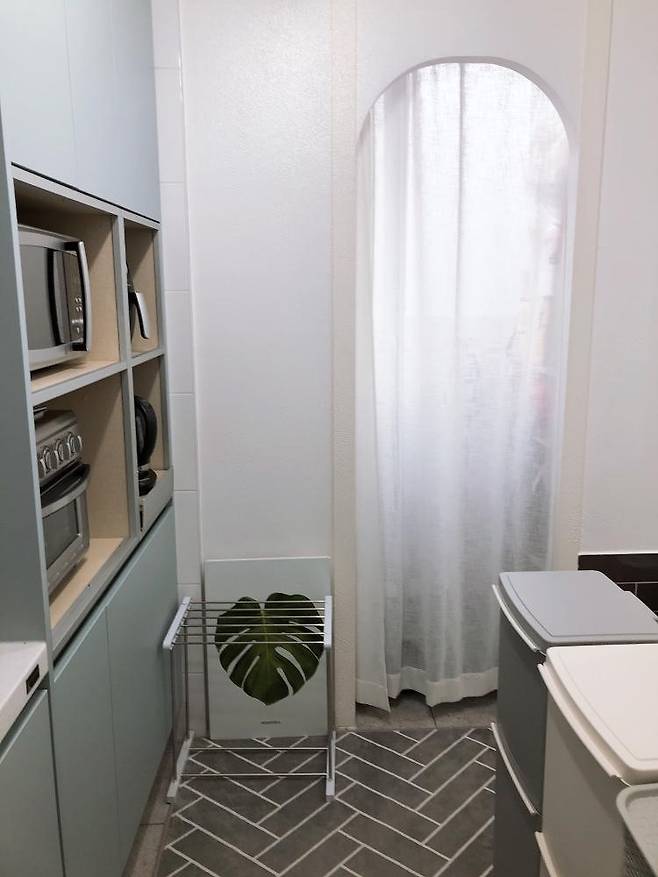 저 커튼 뒤 공간은 본래 실외실로 만든 건데 설치가 마땅치 않아 포기하고 잡다한 짐을 넣을 공간으로 쓰는데 오히려 너무 잘 쓰고 있답니다.