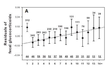 프린스턴대의 진화생물학 교수인 로렌스 제스퀴르와 듀크대 생물학 교수인 니키 런 등은 9년에 걸쳐 개코원숭이 125마리의 스트레스 호르몬을 측정했다. 글루코코르티코이드로 코르티솔이라고 널리 알려진 호르몬이다.