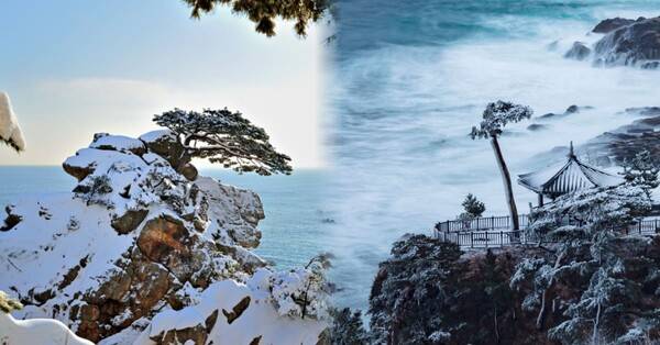 눈이 내리는 날 6시에 문을 여는 낙산사에서 의상대를 바라보면 그림과 같은 모습을 볼 수 있는데요. 강한 파도소리와 함께 절벽 바위에 부딪치는 높은 파도가 인상적으로 느껴지는 곳입니다.