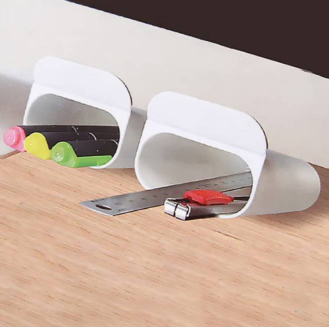당연히 방법은 있다. 바로 다이소의 '모니터 펜 꽂이' 제품을 이용하면 된다. 작은 펜꽃이 2개로 이뤄진 이 물건은 책상을 깔끔히 정리하는 데에 매우 효과적인데, 펜꽂이에 달려있는 양면테이프를 모니터 하단의 공간, 테이블, 벽 등에 가볍게 붙여준 뒤 사무용품 등을 정리해주기만 하면 끝이다. 양면 테이프의 접착력은 보기보다 강력해, 웬만한 물건은 가볍게 수납할 수 있다.