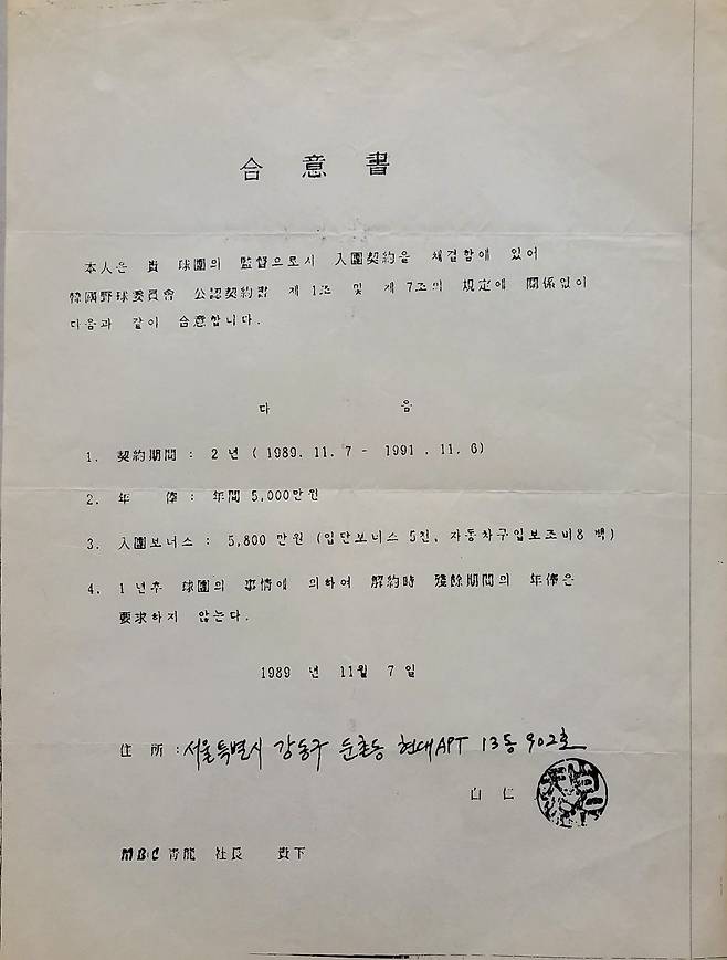 백 감독이 이런 폭탄을 던진 건 LG 트윈스가 창단하기 전 MBC 청룡과 감독계약을 하면서 만들어진 ‘합의서’ 형식의 이면계약 때문이었다.