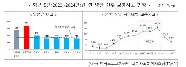 특히 설 연휴 전날은 평소 수준의 약 1.2배인 하루 평균 682건의 교통사고가 발생했다.