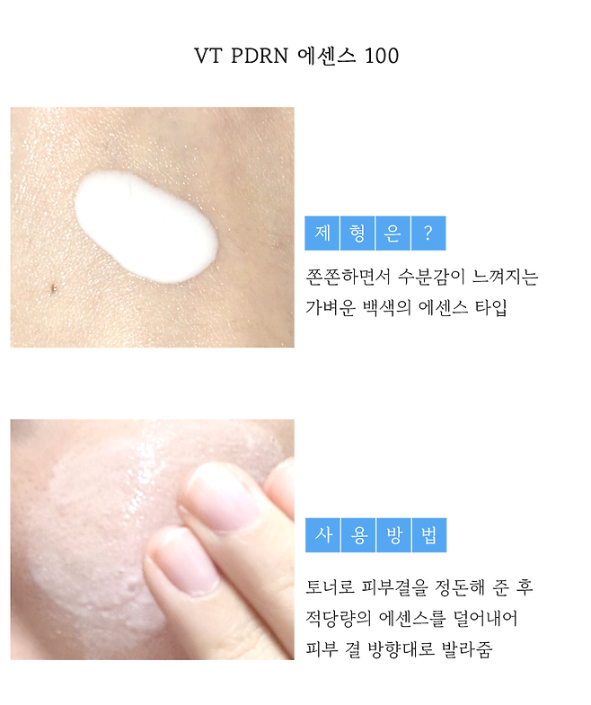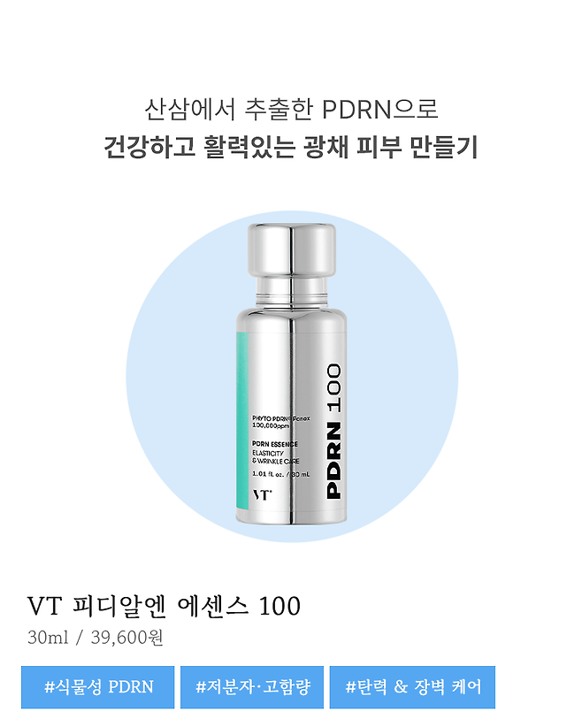 두 번째 추천 에센스는 바로 식물성 PDRN 성분이 가득 담긴 VT의 피디알엔 에센스야.