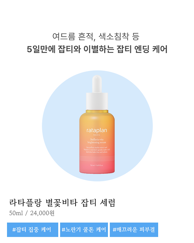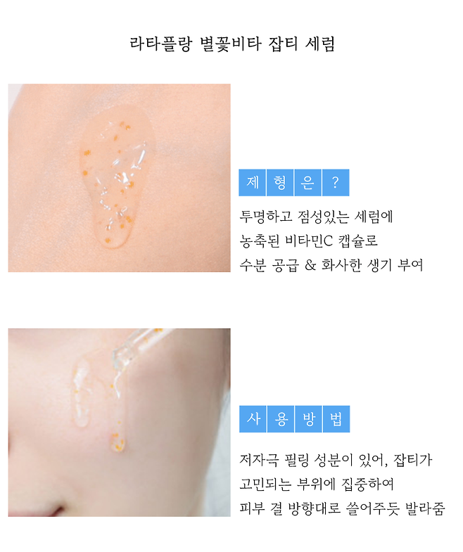 에디터는 여드름이나 뾰루지가 잘 올라오지 않는 편이지만, 한 번 올라오면 그 흔적을 오래 남기는 편이야. 그래서 항상 사용해 주는 게 바로 색소침착을 개선하는데 도움을 주는 화장품들인데, 피부 잡티 흔적, 색소침착도 개선해 주면서 매끄러운 피부 결까지 한꺼번에 케어할 수 있는 라타플랑 별꽃비타 잡티 세럼을 만났지.